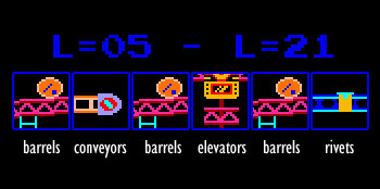 I used to have a picture I found online that showed the screens per level with little pictures of barrels, springs, firefoxes, etc, but for the life of me I can't find it. I spent about an hour so maybe someone has seen this and knows where it is but for now here is a text version